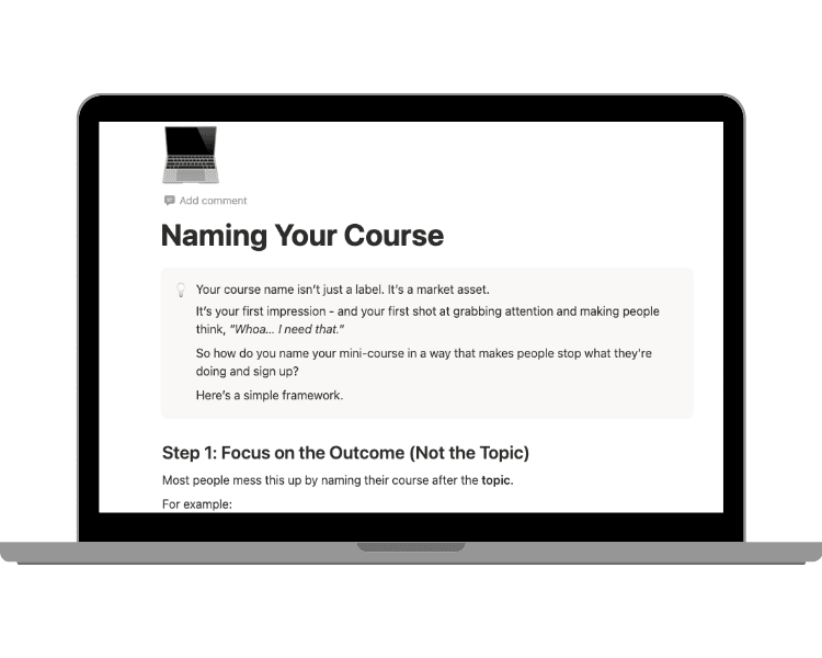 Mini-Course Accelerator includes more than just video lessons. We've created resources that ensure you actually create and launch your mini-course as quickly as possible.